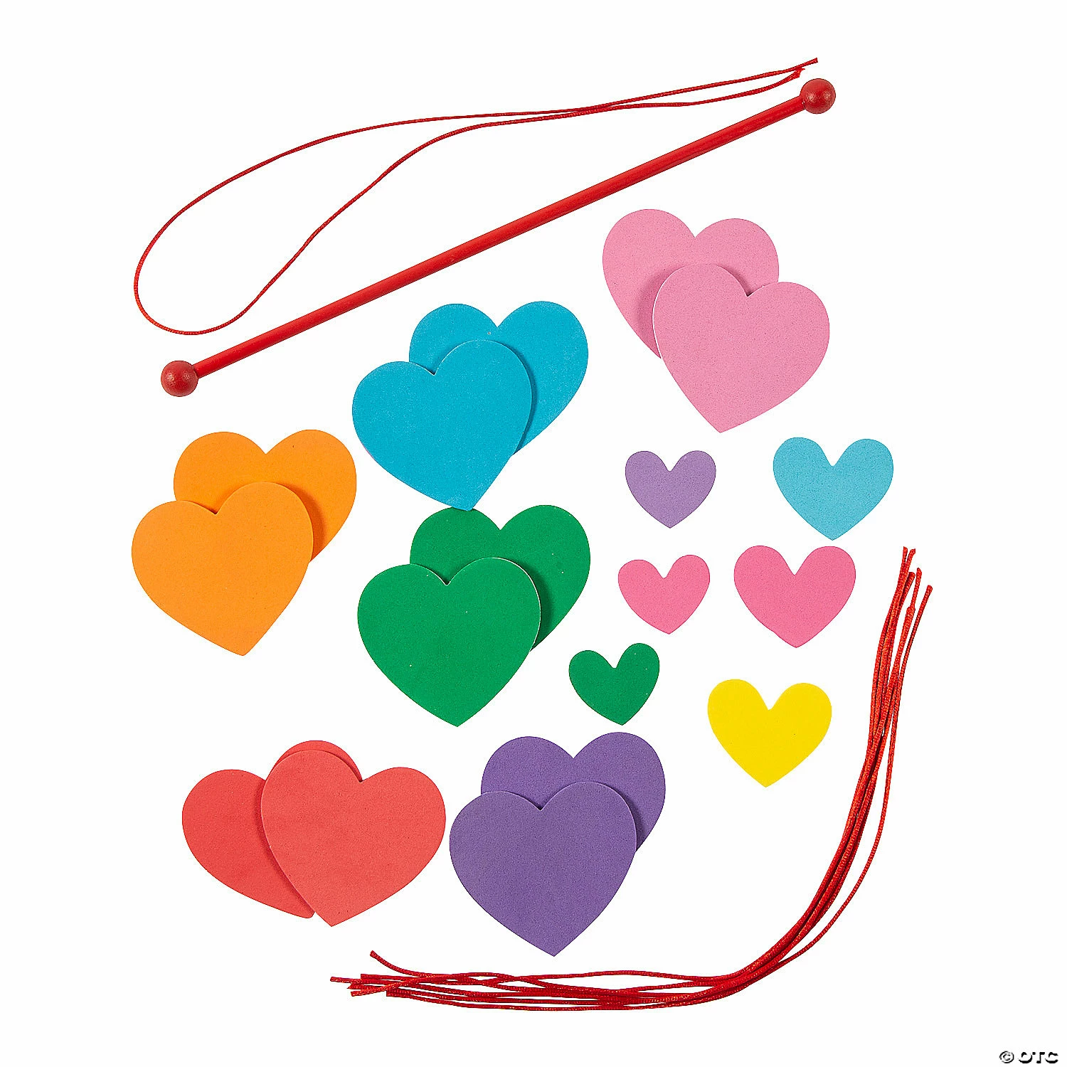 Kids can create their own Valentineโs Day decoration that theyโll be proud to display with this simple and fun craft kit. With enough materials to create up to six adorable hanging hearts mobiles, this craft kit is a great choice for a Valentineโs Day craft activity in the classroom or at home. Be sure to check out all our fun and simple Valentineโs Day crafts on this website! Includes self-adhesive foam pieces, wood dowel and satin cording. 12″ x 19 3/4″ Makes 6. All craft kit pieces are pre-packaged for individual use. Kit includes instructions. ยฉ OTCRainbow Hanging Heart Mobile Instructions